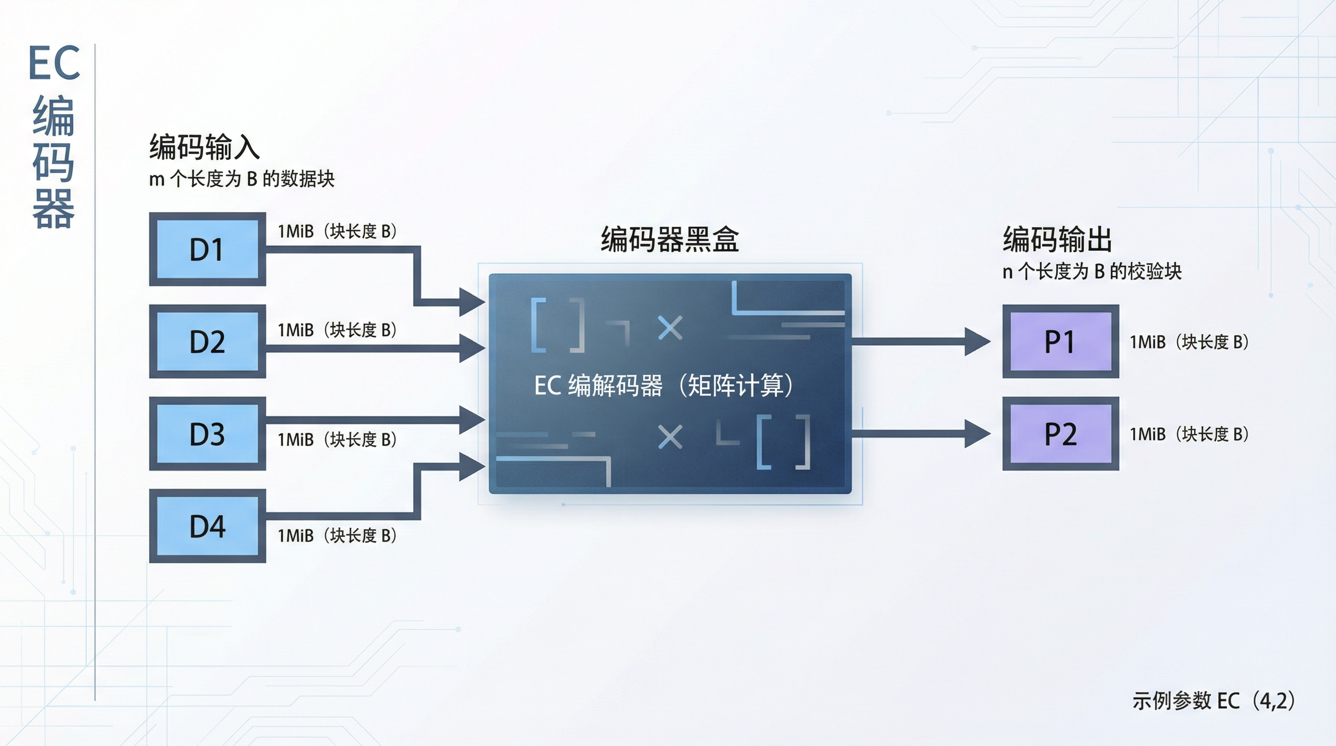 我们也可以决定要输出多少个校验块出来,不妨设为 2 块。则编码器输出 [P1, P2] 共 2 份,每份长度为 1MiB 的校验块。